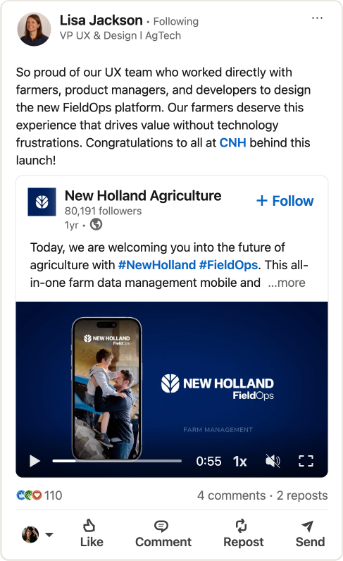 The work helped establish the design foundation for FieldOps, launched by CNH globally across Case IH, New Holland, and STEYR in 2024. Public launch materials positioned the platform as a unified mobile and web experience for managing fleet, field, and machine data, bringing real time visibility and easier decision making into one place.